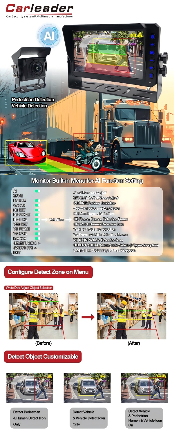 AHD vairuotojo stebėjimo kamera saloneCarleader 7 colių AI BSD aklųjų zonų aptikimo stebėjimo sistemos palaikymas AI kalibravimas sukurtas naudojant pažangius AI didelio tikslumo algoritmus ir patogią meniu cz valdymą. Ši AI kamerų sistema suteikia vairuotojams itin tikslius pėsčiųjų ir transporto priemonių dinaminius įspėjimus bet kokiu oru, efektyviai sumažindama eismo įvykių riziką. AI stebėjimo kamerų sistema tinka privatiems automobiliams, komerciniams parkams ir specialioms transporto priemonėms. Laivyno AI sistema turi stiprią integraciją ir suderinamumą, ilgaamžiškumą ir stebėjimo realiuoju laiku galimybes.