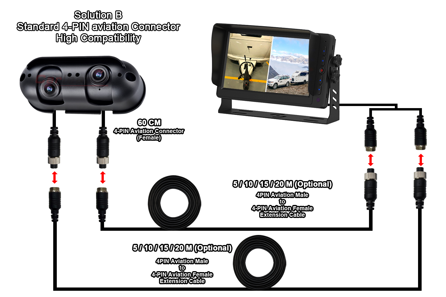 AI aklųjų zonų aptikimo galinio vaizdo kamera Integruota garso ir šviesos signalizacijaCarleader AHD Starlight dvigubo objektyvo galinio vaizdo kamera tinka RV ant ratų, puikios kokybės naujo dizaino asmeninio įrankio AHD kamera, integruota su dvigubu objektyvu vienoje kameroje, o objektyvo kampas reguliuojamas atskirai, todėl vartotojas gali matyti tiek artimą, tiek tolimą vaizdą tame pačiame monitoriuje. Ši kamera tinka ne tik sunkiosioms transporto priemonėms, tokioms kaip sunkvežimis, autobusas, šakinis krautuvas ir kt.; taip pat tinka kemperiams, pavyzdžiui, RV ir karavanams.