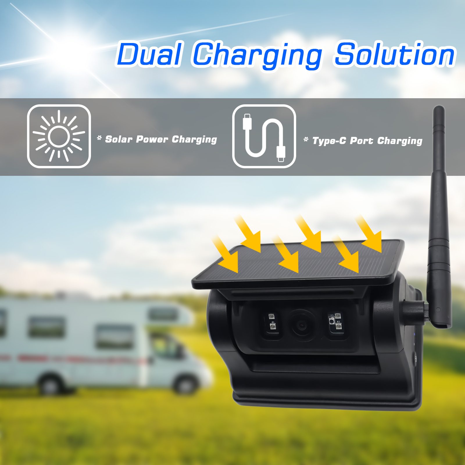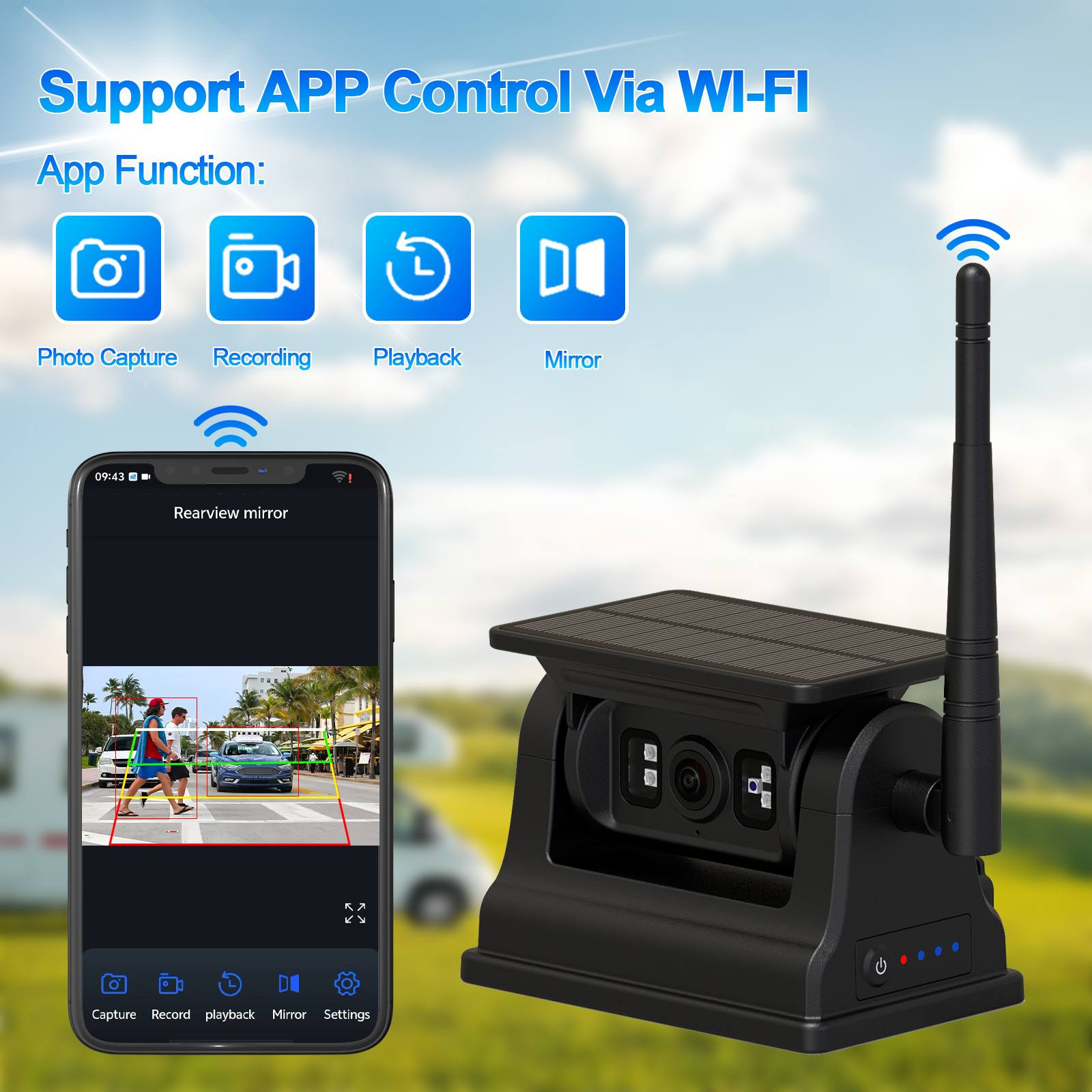 AHD vairuotojo stebėjimo kamera saloneCarleader AI aptikimo saulės energija maitinama įkraunama atbulinės eigos WIFI kamera su magnetiniu pagrindu, nereikia laidų, lengvas montavimas su magnetiniu pagrindu, saulės energija maitinama belaidė atbulinės eigos kamera, įmontuota didelės talpos 10500 mAh įkraunama baterija ir turi naktinio matymo funkciją, taip pat gali būti maitinama saulės energija, energijos taupymu ir aplinkos apsauga. Kamera palaiko AI aptikimo funkciją, gali aptikti pėsčiuosius ir transporto priemones, taip pat spalaiko ryšį su mobiliuoju telefonu per WIFI, leidžia vartotojui fotografuoti, įrašyti vaizdo įrašus ir atkurti, taip pat reguliuoti AI kalibravimą ir kt. Ši kamera yra geriausias pasirinkimas transporto priemonės apsaugos stebėjimo įrangai, kad galėtumėte saugiai vairuoti.