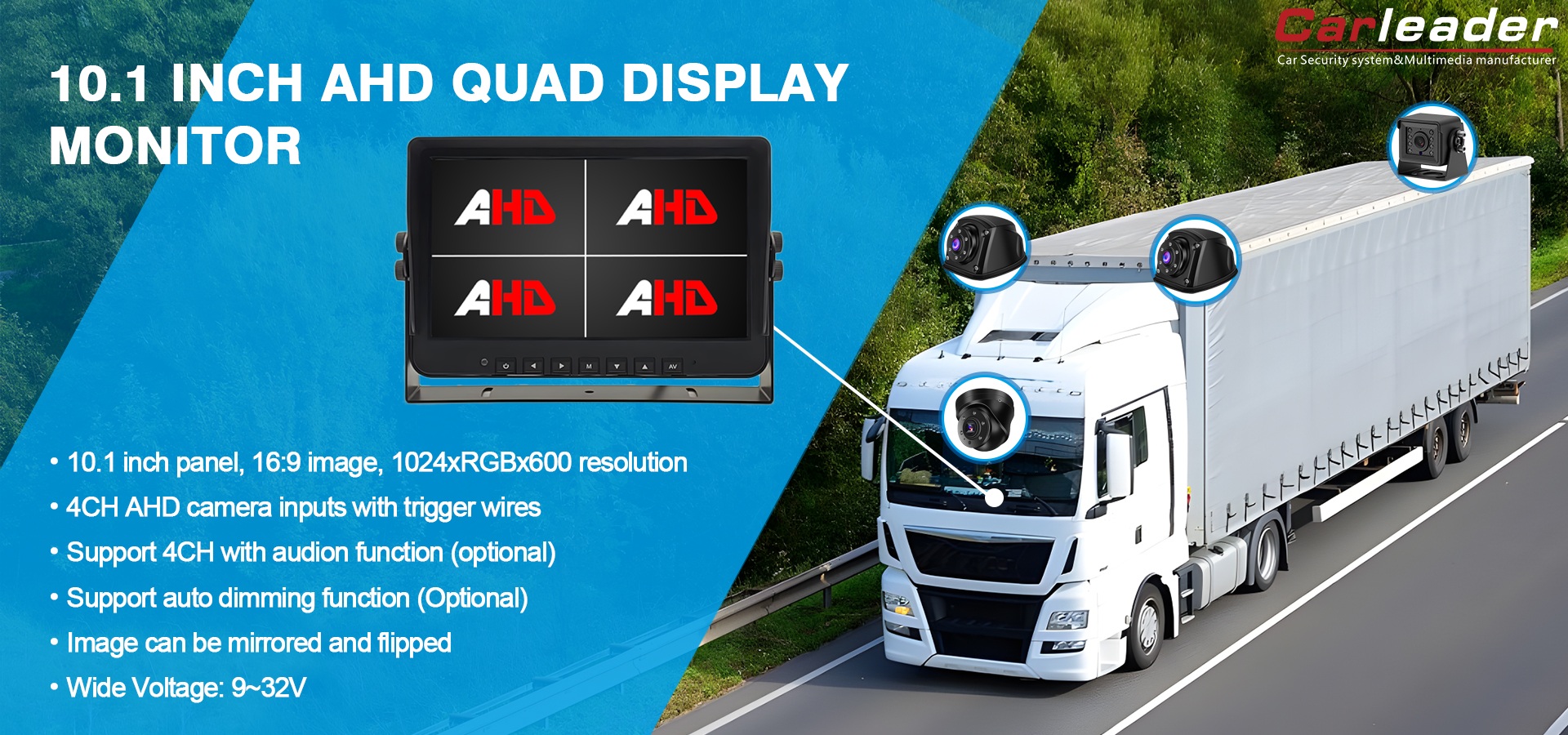 Carleader 10.1 colio 4AV įvesties keturratis AHD transporto priemonės monitoriusir fotoaparato rinkinysĮtraukite 1x aukštos kokybės 10,1 colio „Quad AHD“ monitorių, 1x kabinamojo vaizdo kamerą „Cabin View“, „2x Side View“ kameros (kairėje ir dešinėje), 1x galinio vaizdo kameroje, šis sprendimas, skirtas universaliam stebėjimui ir rodymo programoms. Derinant pažangiausias technologijas su į vartotoju orientuotos funkcijos, šis monitorius pateikia aiškius vaizdus, tvirtą funkcionalumą ir pritaikomumą, kad būtų patenkinti įvairūs veiklos poreikiai.