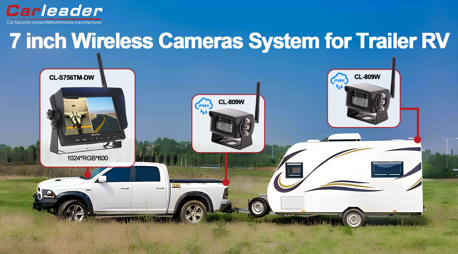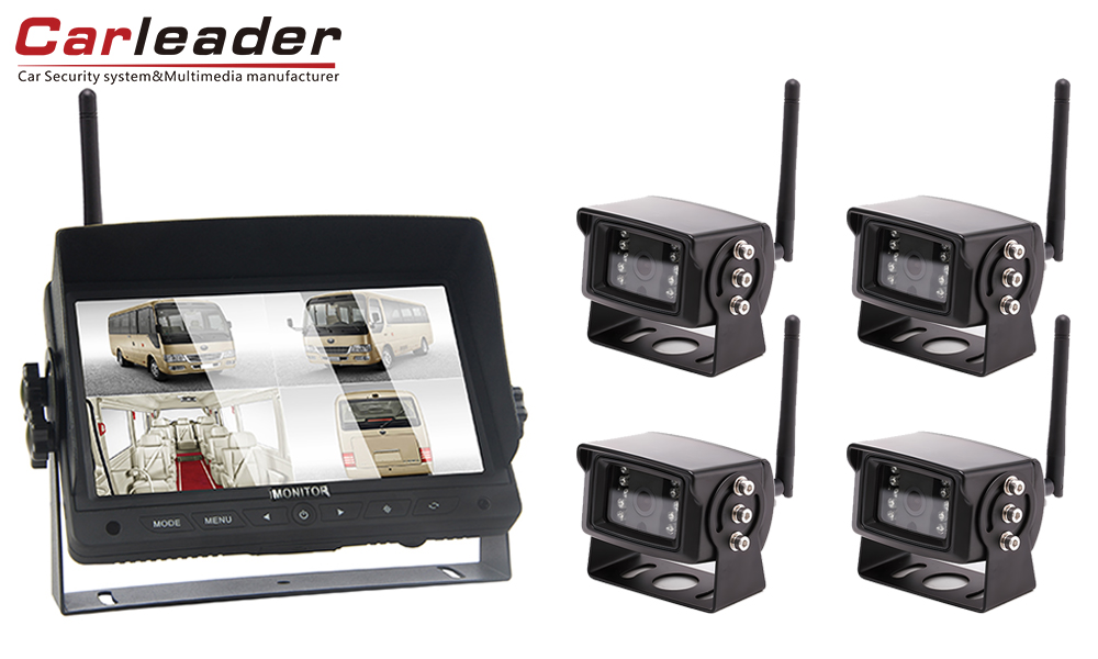 Carleader7 colių 2,4 G skaitmeninė belaidė 2 CH padalinto ekrano kamerų sistema, didelio našumo belaidė stebėjimo sistema, palaikanti 2 ekrano rodinį, susieta su 2 vnt belaidžiu fotoaparatu. 7 colių skaitmeninis skydelis, 16:9 vaizdo santykis, 1024 x 600 (RGB) skiriamoji geba suteikia vairuotojui didelį vairavimo aiškumą.