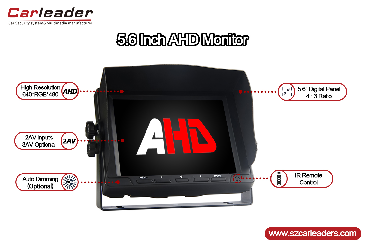 Carleader5,6 colio 2 CH AHD įvesties transporto priemonės atsarginis monitoriusyra profesionalios klasės 5,6 colioAHD galinio vaizdo monitorius, sukurta siekiant pateikti aiškų ir patikimą transporto priemonių saugos ir stebėjimo sistemų vaizdą. Modernaus dizaino ir tvirto funkcionalumo, tai idealus sprendimas komercinėms ir privačioms transporto priemonėms, kurioms reikalingas patikimas vaizdas iš galo.