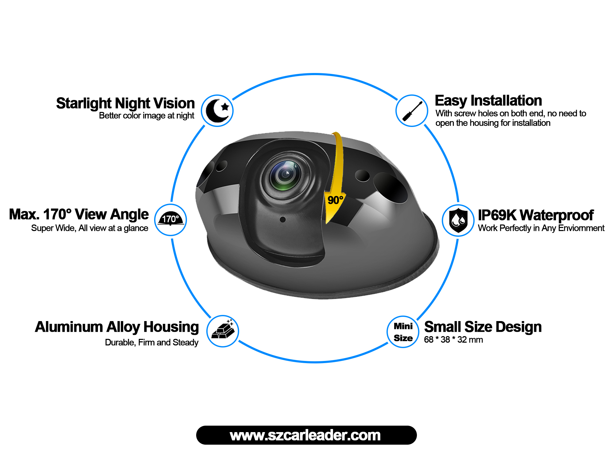 AHD 170 laipsnių plataus matymo kampo vandeniui atspari didelės apkrovos atsarginė kamera suteikia vairuotojui aiškų vaizdą realiuoju laiku vairavimo metu. Itin didelis kampas iki 170°, todėl vairuotojas užtikrina platų stebėjimo diapazoną, kad vairuotojas galėtų stebėti aplinką aplink transporto priemonę be jokių aklųjų zonų.
