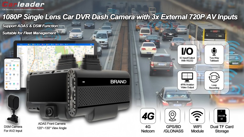 Carleader4 CH AI maitinamas ADAS+DSM Dash Camera palaiko vaizdo išvestįyra didelio našumo vieno objektyvo DVR kamera, sukurta šiuolaikinių transporto priemonių saugos ir stebėjimo poreikiams. Šis įrenginys, aprūpintas pažangiomis vairuotojo pagalbos sistemomis (ADAS) ir vairuotojo būsenos stebėjimu (DSM), siūlo visapusišką saugumą ir įspėjimus realiuoju laiku, kad padidintų vairavimo saugumą.